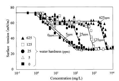 圖9水硬度對烷基硫酸鹽表面張力曲線的影響以及對大型水蚤的有毒表面張力值。