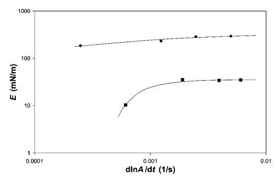 頻率依賴性。 為了評估其中一些系統(tǒng)中粘性損失的重要性,我們對b-lg和HFBII進(jìn)行了頻率相關(guān)的表面膨脹流變。 對于表面膨脹流變學(xué),我們顯示了在18<P<22 mN m-1之間測量的小變形模量(見圖10)。 注意,變形率d(lna)/dt為0.0012 s 1對應(yīng)于5 mm min 1的勢壘速度,用于大變形實(shí)驗(yàn)。 相比之下,歧化時間約為0.5小時,接近泡沫實(shí)驗(yàn)觀察到的粗化時間。 HFBII的數(shù)據(jù)表明,在所研究的變形速率范圍內(nèi),變形速率對E的影響適中。 對于b-乳球蛋白,頻率的影響更為明顯,因此,在變形速率低于0.001 s 1時,可觀察到E的強(qiáng)烈下降。 這表明b-lg的粘性損失比HFBII更為明顯。 這一比較再次表明,b-lg的外觀更柔軟,壓縮/膨脹時解吸/吸附能力更強(qiáng)。