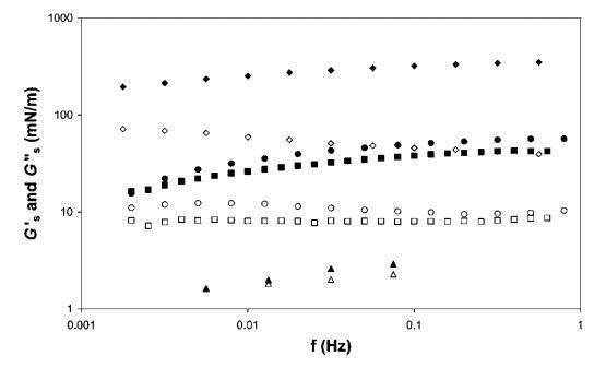 表面剪切流變學(xué)。 所有四個系統(tǒng)的表面剪切流變測量如圖11所示。 我們觀察到HFBII具有模量,比b-乳球蛋白和皂甙高一個數(shù)量級,這與早期結(jié)果一致。25值得一提的是,對于像奎拉葉皂甙這樣的表面活性劑,測得的表面剪切彈性非常高。 b-酪蛋白的表面剪切模量要低一個數(shù)量級。 關(guān)于頻率,我們發(fā)現(xiàn)與HFBII相比,皂甙和b-乳球蛋白對頻率的依賴性更強(qiáng),尤其是在低頻率下。 此外,對于HFBII而言,Gs 00/Gs0的比率是最低的,即表面彈性對模量的貢獻(xiàn)比表面粘度大得多。 當(dāng)我們向交叉點(diǎn)外推時,我們預(yù)計(jì)HFBII和b-乳球蛋白或皂甙之間的弛豫時間會有一個數(shù)量級的差異。 對于b-酪蛋白,從0.01 Hz左右的數(shù)據(jù)可以很容易地觀察到交叉點(diǎn)。
