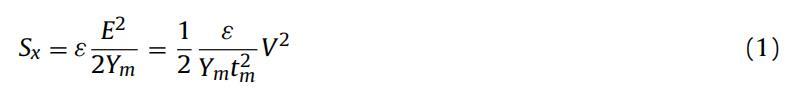 式中,ε是DE膜的介電常數,Ym是DE膜的楊氏模量,E是兩個電極之間的電場,V是施加的電壓,tm是DE膜的厚度。