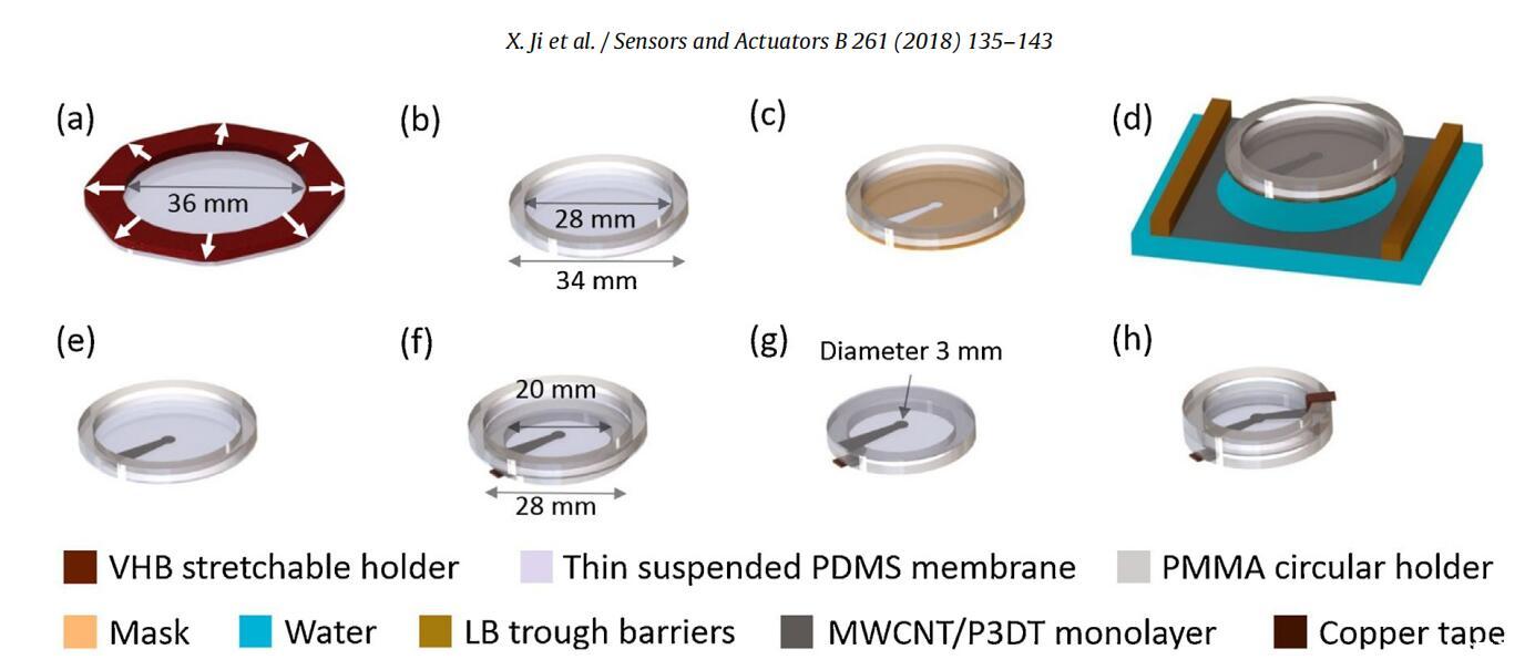 圖2。采用LS技術(shù)制備1.4μm厚DEA的工藝。(a)懸浮式PDM(Sylgard 186)等雙軸預(yù)拉伸(初始厚度:2.0μm,拉伸后:1.4μm)。(b)懸浮拉伸1.4μm厚的PDMS膜,固定在PMMA支架上。(c)在懸浮膜上放置一個面罩。(d)在空氣-水界面形成的單層電極在帶有掩膜的懸浮PDMS膜上的LS轉(zhuǎn)移。(e)PDMS上的圖案化單層電極。(f)將覆蓋有圖案化單層電極的PDMS膜轉(zhuǎn)移到較小的PMMA支架上。(g)圖案化單層電極位于PDMS的下側(cè),電極與銅帶連接,PDMS的上側(cè)不帶電極。(h)采用LS電極技術(shù)制造DEA。