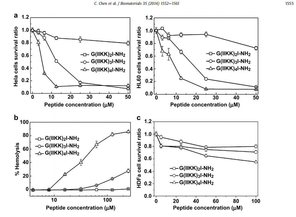開(kāi)發(fā)對(duì)宿主細(xì)胞具有良好生物相容性但對(duì)癌細(xì)胞具有高效力的功能性生物材料和藥物是一項(xiàng)具有挑戰(zhàn)性的工作。通過(guò)利用天然抗菌肽和a-螺旋蛋白的優(yōu)勢(shì)特性,我們?cè)O(shè)計(jì)了一類新的短a-螺旋肽G(IIKK)nI-NH2(n細(xì)胞)。我們表明,含有?n1e4的肽具有不同的效力和對(duì)癌癥?3和4的高選擇性,能夠有效殺死癌細(xì)胞,同時(shí)在其工作濃度下對(duì)宿主細(xì)胞保持良性,通過(guò)類似于殺菌效果的機(jī)械過(guò)程。細(xì)胞的高選擇性可能源于它們優(yōu)先與帶有負(fù)電荷和高流動(dòng)性的細(xì)胞外膜結(jié)合。除了快速透膜能力外,這些肽還可以通過(guò)線粒體途徑和死亡受體途徑誘導(dǎo)癌細(xì)胞的程序性細(xì)胞死亡,而不會(huì)誘導(dǎo)非特異性免疫原性反應(yīng)。重要的是,這些肽還可以在小鼠異種移植模型中抑制腫瘤生長(zhǎng),而不會(huì)引起副作用。雖然這項(xiàng)研究揭示了這些肽作為強(qiáng)效藥物和其他醫(yī)療保健應(yīng)用的臨床潛力,但它也指出了基礎(chǔ)材料研究在高選擇性肽功能材料未來(lái)發(fā)展中的重要性。