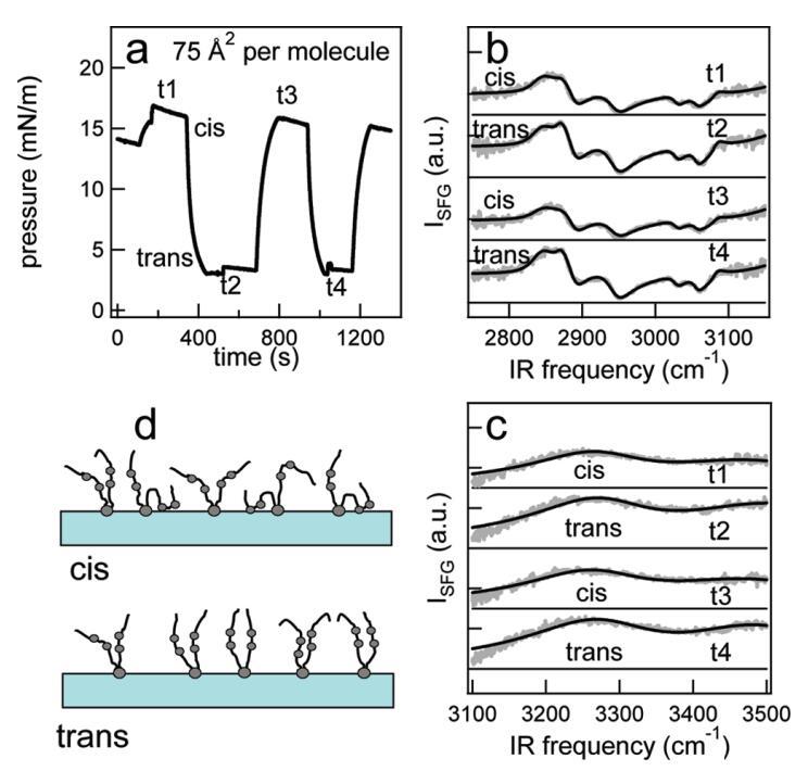 圖4:(a)在每分子75?2的面積處,脂質/H2O界面處的光開關脂質的表面壓力作為時間的函數。370和450 nm光照射~100秒分別產生cis(高壓)和trans(低壓)狀態。壓力的微小劇烈波動是由于樣品高度的變化,以校正水的蒸發。(b和c)CH和OH區域(灰色)中相應的VSFG光譜,以及洛倫茲線形狀模型的擬合(見正文)。為了清晰起見,對光譜進行了偏移。t1至t4對應于面板a中進行光譜測量的時間。(d)脂質尾部方向示意圖。光開關脂質的偶氮苯部分用灰色圓圈表示。