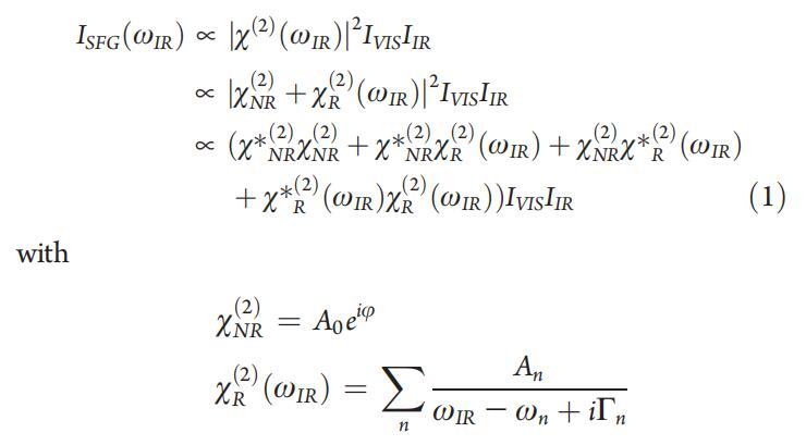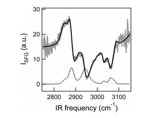 圖3:。在密度為75?2/分子和壓力為~3 mN/m。共振信號疊加在大型非共振背景上,由于共振信號和非共振信號之間的干擾,導致色散線型。黑色虛線表示NR振幅設置為零時的DT Azo-5P信號。