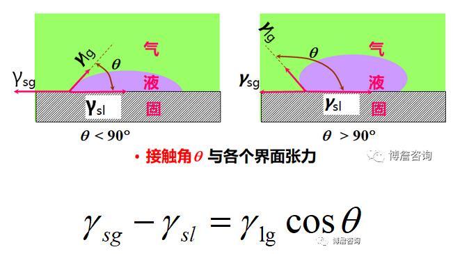 由楊氏方程,θ由γsg,γsl,γlg決定。對(duì)于指定的固體,液體表面張力越小,其在該固體上的θ也越小。對(duì)于同一液體,固體表面能越大,θ越小。