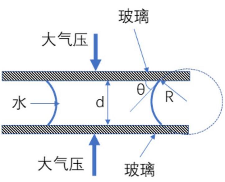 我們看到,這個凹液面就形成了一個「反向」的緊繃的膜。就像是氣球一個道理,這種曲面的膜,由于表面張力的原因,就會使得液體的壓力P小于外部大氣壓P0。因而把玻璃擠壓在一起的力,就不是P0而是P0-P。