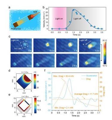 研究人員研制的驅(qū)動薄膜中具有光熱效應(yīng)極好的氧化石墨烯(GO)材料,可將光能轉(zhuǎn)換成熱能,當(dāng)光照射漂浮于水面上的驅(qū)動薄膜時,薄膜會產(chǎn)生一定的溫度并傳遞給周圍的液體,造成局部水溫升高進而影響水的表面張力。