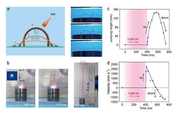 光刺激下驅(qū)動器可以在極短的響應(yīng)時間(400 ms)內(nèi)從液體介質(zhì)跳越到空氣中,最高速度為2 m/s,高度可達(dá)14.3 cm。