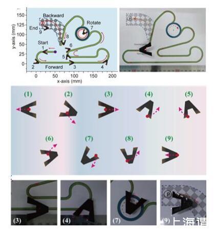 前進后退解決之后,就該考慮薄膜在遇到彎道時的轉(zhuǎn)彎問題,如何做到薄膜在向前游動的同時方向還可以轉(zhuǎn)變呢?通過計算薄膜轉(zhuǎn)彎時合力的方向,我們很快就設(shè)計出分力所存在的位置,于是在梯形的基礎(chǔ)上裁掉一塊梯形面積后,通過照射特定的部位就可以實現(xiàn)各類游動行為。