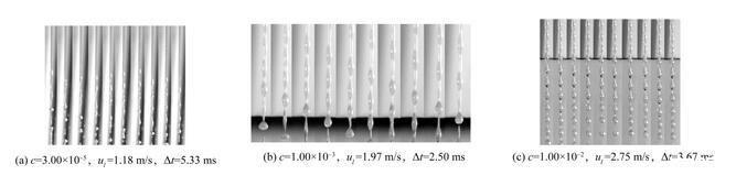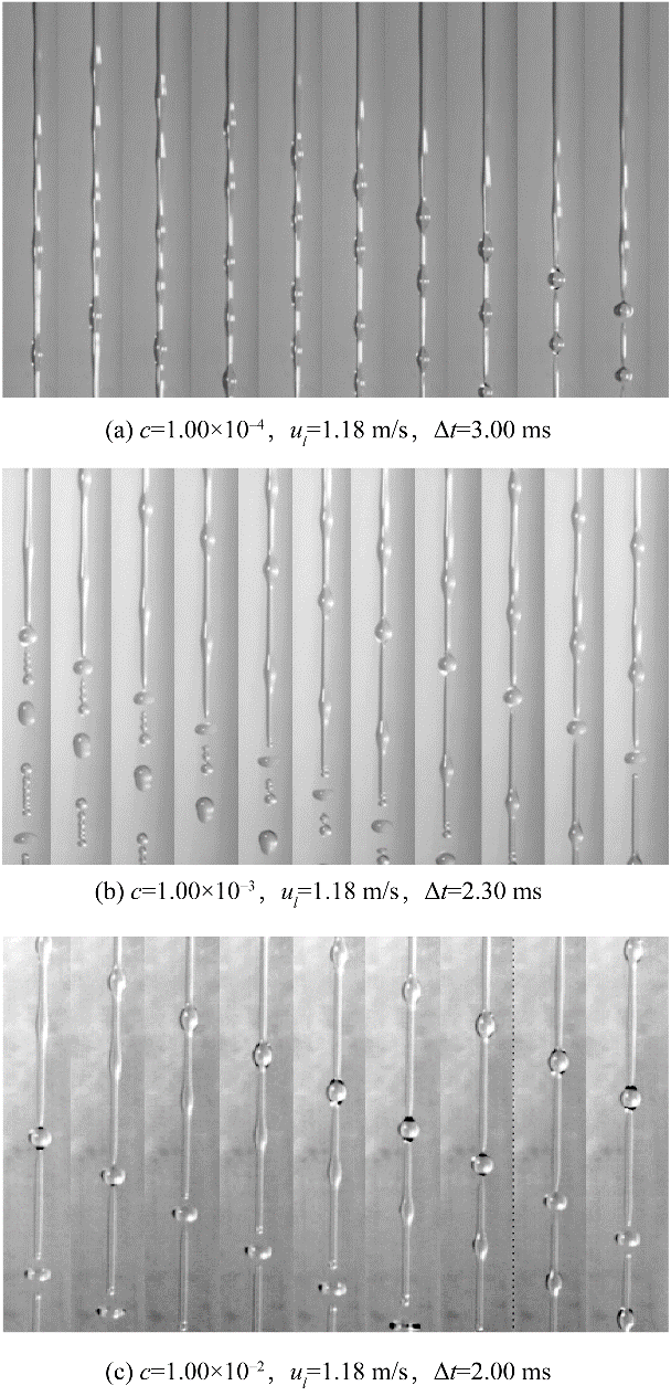 本文首先研究了不含氣泡的表面活性劑射流破裂過程以探究表面張力變化對射流破裂特征的影響。實驗使用高速相機記錄了六種不同濃度表面活性劑溶液的射流破裂過程。實驗獲得的射流破裂過程如圖5所示,其中Δt是相鄰兩張圖片間的時間間隔。從圖5中可以看出,雖然表面活性劑濃度并不相同,但射流的破裂過程在形態(tài)上是相似的。當液體射流離開噴嘴后,射流表面擾動迅速增長,表面波動在射流表面呈對稱分布,這是射流破裂Rayleigh區(qū)的典型特征。隨著表面波動的進一步發(fā)展,在射流方向上,射流表面形成瘤狀結(jié)構(gòu),射流破裂發(fā)生在兩個瘤狀結(jié)構(gòu)之間。
