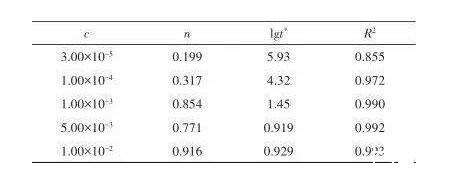 圖4展示了不同SDBS濃度下lg S隨lg t的變化規(guī)律,圖中實線對應各濃度下動態(tài)表面張力的擬合曲線,此時圖中時間t的單位為ms。從圖中可以看出,擬合結(jié)果與實驗數(shù)據(jù)吻合較好,擬合曲線能夠較好地表征動態(tài)表面張力的時間演變趨勢。擬合得到的系數(shù)見表1。