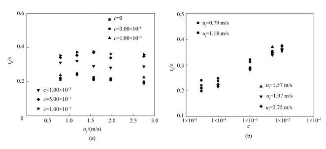 從圖7(a)中可以看出,當表面活性劑濃度保持不變時,射流破裂時間幾乎不隨射流速度的改變而改變。在射流速度保持不變時,隨著表面活性劑濃度的增大,射流破裂時間呈現(xiàn)逐漸增長的趨勢。在實驗參數(shù)范圍內(nèi),射流破裂時間均小于0.4 s。考慮重力對液體射流的加速作用,液體射流實際破裂時間要小于0.4 s。