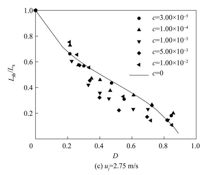 圖11是不同濃度表面活性劑射流破裂長度L sb隨氣泡無量綱直徑D=d b/d 0(d b為氣泡直徑)的變化。從圖中可以看出,不同表面活性劑濃度下,射流破裂長度隨氣泡無量綱直徑D的變化趨勢是相似的。射流破裂長度隨著氣泡直徑的增大逐漸減小;當氣泡直徑相同時,提高液體射流速度會導致更大的射流破裂長度。