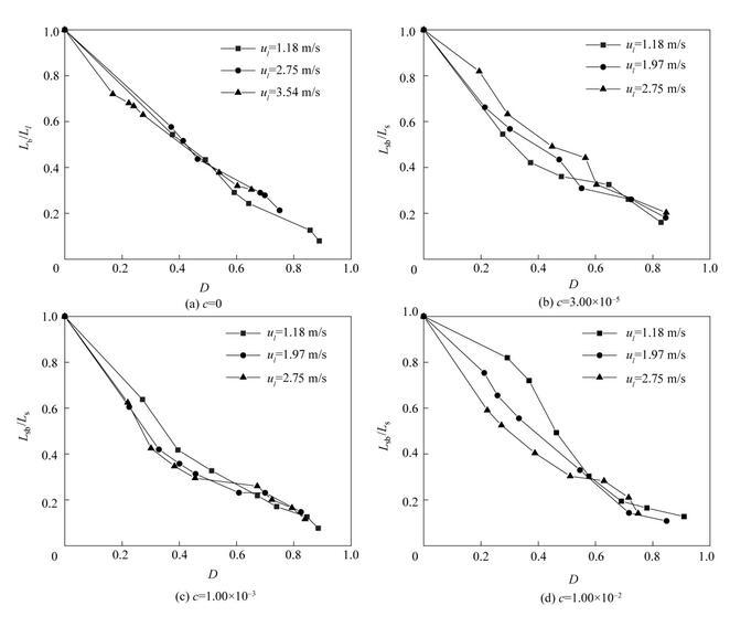 如圖12所示,當氣泡直徑較大時,破裂長度比基本不隨射流速度的改變而改變。這是由于此時氣泡引起的射流速度擾動對射流破裂的影響占主導地位。在氣泡直徑較小時,當表面活性劑濃度c<1.00×10-2,不同射流速度下射流破裂長度比基本相同。當表面活性劑濃度c=1.00×10-2,破裂長度比隨著射流速度的增大而逐漸減小。這可能與被削弱的Marangoni效應有關(guān)。由式(10)可知,液體射流速度越大,液體對流造成的表面活性劑表面吸附量減少的趨勢越強,波峰波谷間的表面張力差值越小,Marangoni效應越弱,射流破裂長度增加的趨勢越弱。因此,在氣泡較小時,隨著射流速度的增大,含氣泡射流的破裂長度比逐漸減小。在表面活性劑濃度較小時,氣泡的存在進一步減小了射流內(nèi)部表面活性劑的濃度,從而使得不同射流速度下Marangoni效應的差別不明顯,不同射流速度下射流破裂長度比基本相同。