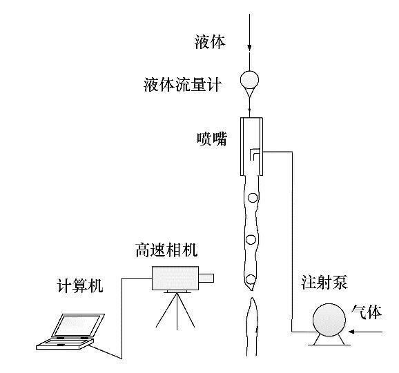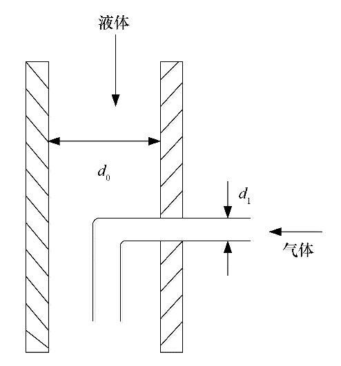 實驗流程如圖1所示。來自注射泵的氣體通過充氣通道進入噴嘴并在噴嘴內(nèi)形成氣泡,并與來自液體流量計的液體相混合形成氣液混合物。該氣液混合物離開噴嘴后,在不穩(wěn)定波的作用下發(fā)生破裂,使用高速相機記錄這一過程,并使用開源軟件ImageJ分析處理得到的圖片。實驗通過控制注入噴嘴的氣體流量從而得到不同液體射流速度下直徑近似相等的氣泡。實驗使用的噴嘴如圖2所示。其中,噴嘴內(nèi)徑d 0=2.96 mm,充氣通道外徑d 1=0.50 mm。