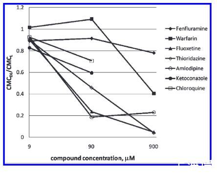 圖4.CMC移位(通過(guò)將藥物-脂質(zhì)復(fù)合物(DL的CMC之間的比率表示)和單獨(dú)的脂質(zhì)(L)的CMC:CMC測(cè)試化合物與二FF erent科幻最終在濃度樣品孔在pH7.2。