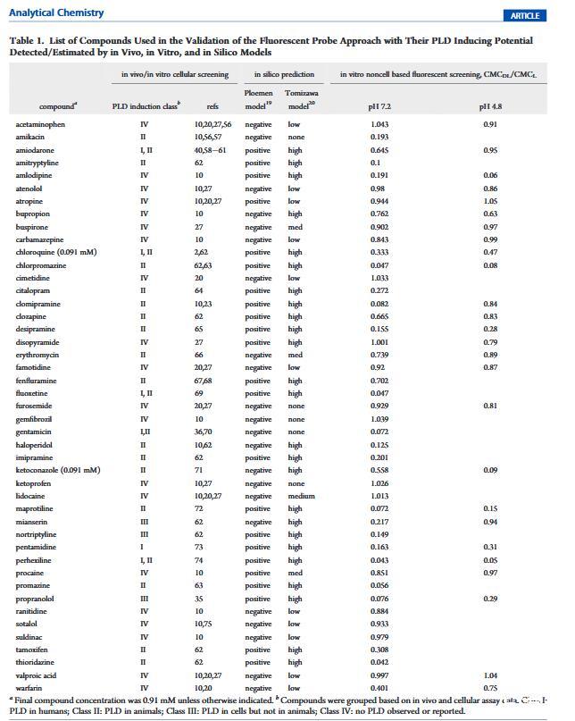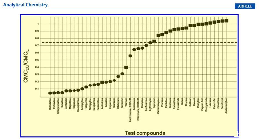 濃度依賴(lài)性。體內(nèi)研究中PLD的程度是劑量依賴(lài)性的。24,33在體外試驗(yàn)中,濃度控制可用于估計(jì)劑量依賴(lài)性。一組七種報(bào)告的PLD誘導(dǎo)劑分別以三種不同的濃度進(jìn)行了測(cè)試:910、91和9.1μM(圖4)。對(duì)于氯喹和酮康唑,要么它們?cè)?0 mM時(shí)不能完全溶解在DMSO中,要么在使用10 mM DMSO儲(chǔ)備液時(shí)與緩沖液混合后鹽析出來(lái),它們的最高濃度點(diǎn)被去除。所有化合物都表現(xiàn)出對(duì)CMC的濃度依賴(lài)性,以不同程度改變PLD誘導(dǎo)潛力。即使在910μM時(shí),芬氟拉明似乎也是一種弱誘導(dǎo)劑,而硫利達(dá)嗪在不同濃度之間顯示出顯著變化。根據(jù)該體外數(shù)據(jù),在9.1μM的最低濃度下,七種化合物中沒(méi)有一種似乎能夠誘導(dǎo)PLD。復(fù)合自聚合。與磷脂類(lèi)似,大多數(shù)PLD誘導(dǎo)劑是兩親性的。盡管帶有不同的電荷跡象,但它們也可以聚集并形成膠束。拉貝洛爾20,34和奎尼丁35被報(bào)道為PLD誘導(dǎo)劑;然而,在所應(yīng)用的測(cè)試條件下,我們無(wú)法確定任何一種藥物脂質(zhì)復(fù)合物的CMC。獲得的RFU值等于或低于空白(含熒光探針但不含脂質(zhì)的化合物)中的值。進(jìn)一步研究了不同藥物濃度但沒(méi)有脂質(zhì)(0 mg/mL脂質(zhì)),并且在無(wú)脂質(zhì)測(cè)定緩沖液中,拉貝洛爾和奎寧的CMC值分別為26和20μM。這些CMC值遠(yuǎn)低于這些化合物在PLD篩選中的測(cè)試濃度,并且懷疑化合物的自聚集會(huì)干擾藥物脂質(zhì)復(fù)合物形成的檢測(cè),從而使CMCDL無(wú)法確定。