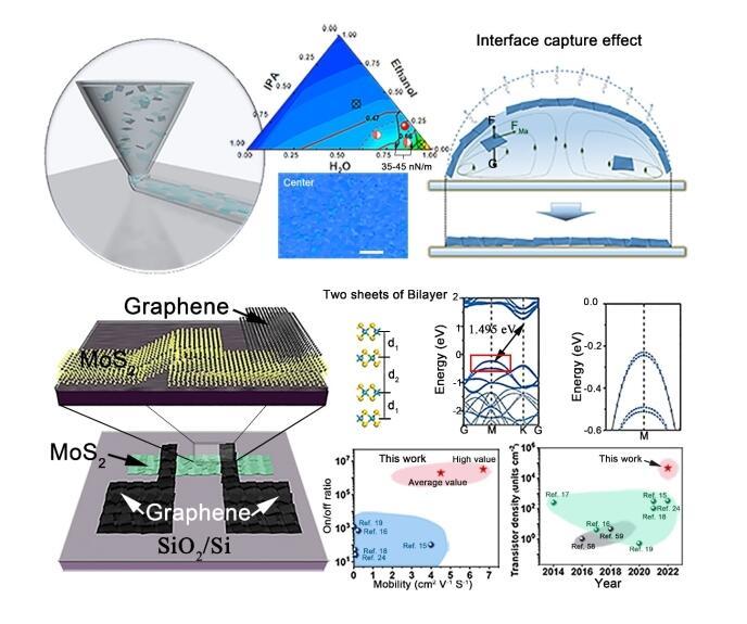 二維(2D)半導體材料為將摩爾定律擴展到原子尺度提供了機會。與傳統(tǒng)基于蒸鍍和光刻技術的加工技術相比,印刷電子因成本效益、靈活性以及與不同襯底的兼容性而受到關注。目前,印刷的二維晶體管受到性能不理想、半導體層較厚和器件密度低的制約。同時,多數二維材料油墨通常使用高沸點溶劑,隨之而來的問題包括器件性能退化、高材料成本和毒害性等,難以大規(guī)模應用。因此,發(fā)展簡單且環(huán)保的策略對于制造低成本、大規(guī)模的打印二維材料功能器件具有重要意義。