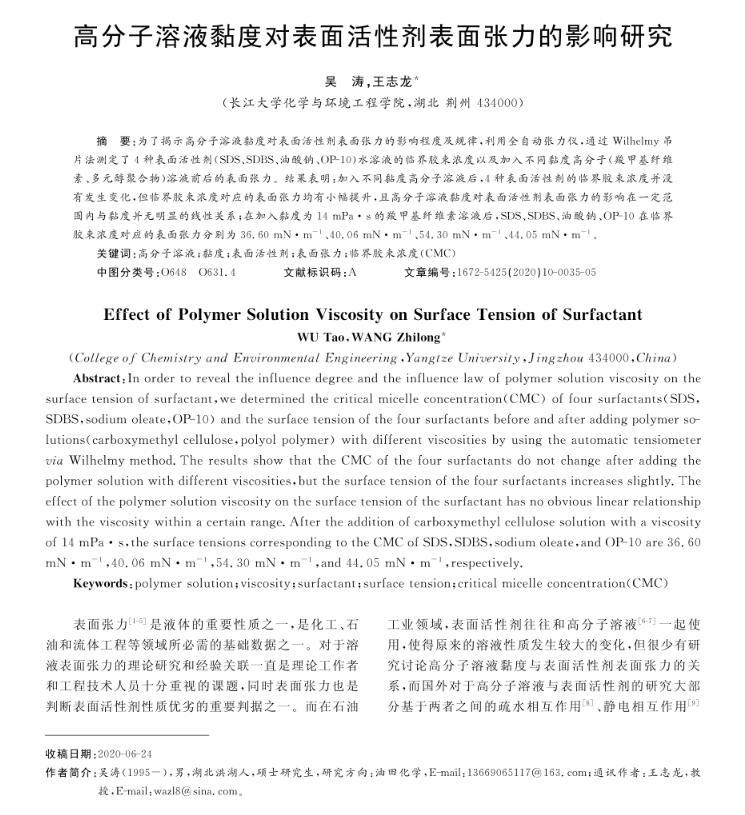 為了揭示高分子溶液黏度對表面活性劑表面張力的影響程度及規(guī)律,利用全自動張力儀,通過Wilhelmy吊片法測定了4種表面活性劑(SDS、SDBS、油酸鈉、OP-10)水溶液的臨界膠束濃度以及加入不同黏度高分子(羧甲基纖維素、多元醇聚合物)溶液前后的表面張力。結(jié)果表明:加入不同黏度高分子溶液后,4種表面活性劑的臨界膠束濃度并沒有發(fā)生變化,但臨界膠束濃度對應的表面張力均有小幅提升,且高分子溶液黏度對表面活性劑表面張力的影響在一定范圍內(nèi)與黏度并無明顯的線性關(guān)系;在加入黏度為14 mPa·s的羧甲基纖維素溶液后,SDS、SDBS、油酸鈉、OP-10在臨界膠束濃度對應的表面張力分別為36.60 mN·m~(-1)、40.06 mN·m~(-1)、54.30 mN·m~(-1)、44.05 mN·m~(-1)。