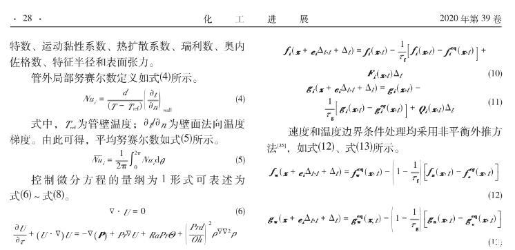 【摘要】:采用格子-玻爾茲曼方法 (LBM)構(gòu)建了考慮表面張力影響下封閉腔體內(nèi)加熱圓柱外自然對流數(shù)學(xué)模型。在分別對自然對流與表面張力模型模擬驗證的基礎(chǔ)上,探究了液固表面張力與重力場下浮升力同時作用下加熱圓柱外流體自然對流的傳熱特性。結(jié)果表明,在給定Ra數(shù)下(103≤Ra≤106),隨著表面張力的增大(Oh數(shù)減小),封閉腔體內(nèi)管外自然對流擾動會加劇,流型會變復(fù)雜,壁面換熱效率有明顯提高。