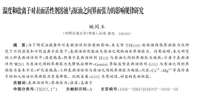 溫度和鹽離子對表面活性劑溶液與原油之間界面張力的影響規律研究