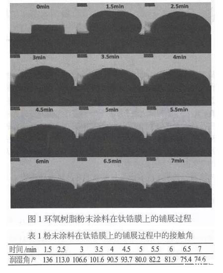 楊雲予等人利用接觸角測量儀在恒溫180℃下,拍出了不同時刻圓柱狀粉末涂料在鋁合金鈦鋯膜上的熔融和鋪展過程圖,并記錄了的潤濕角,為研究粉末涂料固化過程中,凝膠前的接觸角變化提供了依據。