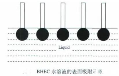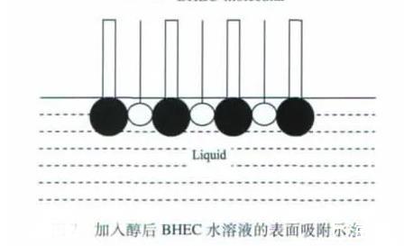 乙醇和正丁醇屬于一元醇,這兩種醇的加入能使BHEC水溶液的表面張力減小。當(dāng)未加入一元醇時(shí),BHEC溶于水后,BHEC分子能自發(fā)地吸附在溶液的表面,使溶液的表面張力降低,表面吸附的BHEC分子越多,溶液表面張力的降幅越大,當(dāng)然這其中有一個(gè)吸附飽和的問題。但由于BHEC分子在水中處于空間交聯(lián)網(wǎng)絡(luò)結(jié)構(gòu),其定向排列時(shí)分子間存在一定的空間(見上圖)。加入乙醇或正丁醇后,醇分子可以插入BHEC分子間的空隙,使溶液表面吸附的分子達(dá)到緊密排列的狀態(tài)(見下圖),導(dǎo)致BHEC水溶液的表面張力繼續(xù)降低。