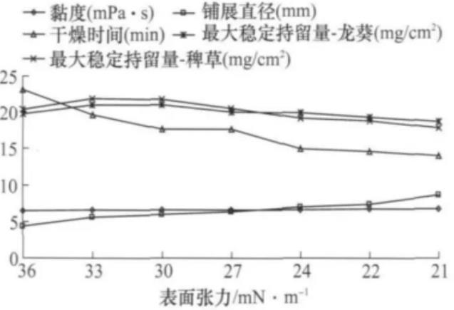 通過本研究可以說明適當(dāng)?shù)亟档筒莞熟⒅苿┑谋砻鎻埩蛟黾羽ざ染商岣叱輨┑纳锘钚浴3輨┗钚阅芊癯浞职l(fā)揮往往決定于霧滴在雜草葉表面的黏著、展布、濕潤(rùn)、滲透與傳導(dǎo)。不同雜草的葉片結(jié)構(gòu)及生理機(jī)制往往對(duì)藥液理化性狀和藥液敏感性不同,本研究中液滴的鋪展直徑、干燥時(shí)間均采用石蠟?zāi)M植物葉片蠟質(zhì)層結(jié)構(gòu),僅能體現(xiàn)藥液理化性狀的相對(duì)變化趨勢(shì),而不同類型的雜草對(duì)藥液物理性狀和藥液敏感性需進(jìn)一步研究。