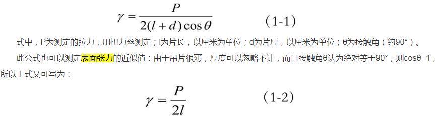 此公式也可以測定表面張力的近似值:由于吊片很薄,厚度可以忽略不計,而且接觸角θ認為絕對等于90°,則cosθ=1,所以上式又可寫為: