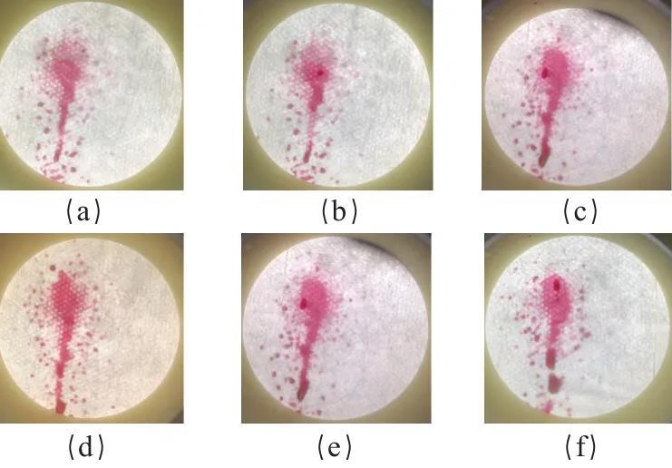 根據表1、表2,結合圖1和圖2可知,合成血液的穿透性能會隨著表面張力的降低而增加,表面張力大于40mN/m時,醫用外科口罩內表面沒有出現血液穿透現象。當表面張力低于40mN/m時,口罩內表面出現微量血液穿透現象。這是由于合成血液對醫用外科口罩材料的穿透能力主要由合成血液在固體表面的展開情況決定的;而表面張力是合成血液模擬真實血液中需要評定的一個重要物理指標,合成血液的表面張力越小,那么它在口罩表面展開的體積就越大,越容易進入固體內部。人體體液(不包括唾液)的表面張力范圍在42mN/m至60mN/m之間,因此,為確保試驗的準確性,應使用表面張力在(42±2)mN/m范圍內的合成血液。
