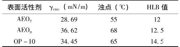 表面活性劑:脂肪醇聚氧乙烯醚AEO7(碳原子12,乙氧基數即EO數7),海安石油化工廠產品;脂肪醇聚氧乙烯醚AEO9(碳原子12,乙氧基數即EO數9)海安石油化工廠產品;辛基酚聚氧乙烯醚(OP-10,碳原子8,EO數10),廣州樂恒化工有限公司產品;去離子水。