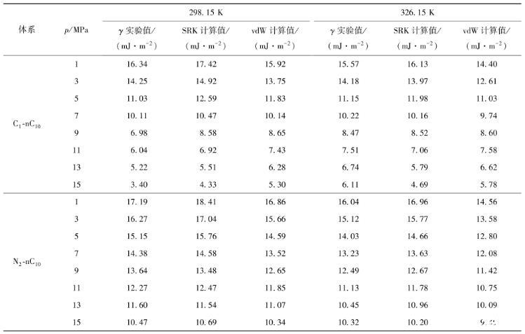 (2)與vdW模型和實驗數(shù)據(jù)對比表明:在相同的溫度下,隨著壓力的升高,C1-nC10和N2-nC10混合物在納米孔中的界面張力逐漸減小,SRK和vdW模型均能準(zhǔn)確地預(yù)測界面張力。