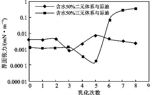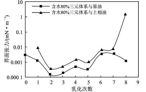 從總體上看,水相與原油間的界面張力低于其與上相油間的界面張力,在乳化第6次以后兩者開(kāi)始趨同。說(shuō)明乳化會(huì)導(dǎo)致油相中的組成發(fā)生變化,進(jìn)而導(dǎo)致油相性質(zhì)發(fā)生變化。因此在復(fù)合驅(qū)驅(qū)替的適當(dāng)時(shí)機(jī)應(yīng)對(duì)驅(qū)油體系的配方進(jìn)行相應(yīng)調(diào)整。