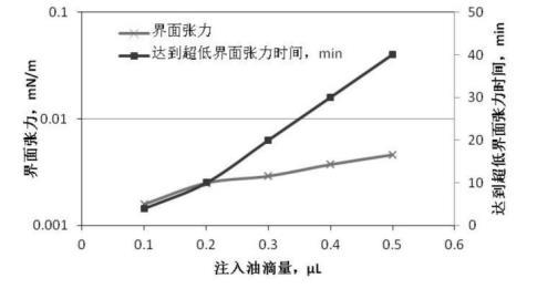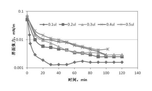圖3、圖4是根據(jù)前述實(shí)驗(yàn)步驟1、2提供的配置與測量方法,油滴注入量分別為0.1μL、0.2μL、0.3μL、0.4μL、0.5μL,無堿二元驅(qū)配方體系與高凝油間界面張力的關(guān)系曲線。從圖2可知:無堿二元驅(qū)配方體系與高凝油間的界面張力達(dá)到超低界面張力的時(shí)間隨著油滴注入量的增多明顯延長,注入油滴0.1μL,4分鐘達(dá)到超低界面張力,注入油滴0.5μL,40分鐘達(dá)到超低界面張力;從圖4可知:注入油滴量大于0.3μL以后,對無堿二元驅(qū)配方體系與高凝油間界面張力的測定不能持續(xù)2小時(shí),油滴在100分鐘發(fā)生斷開,對于高凝油而言,油滴注入量小于0.3μL較適合。