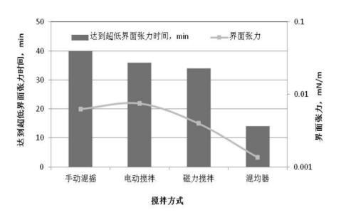 mN/m;手動混搖的方式達(dá)到超低界面張力的時(shí)間最長,為40分鐘,電動攪拌和磁力攪拌差別不大?;靹蚱鲾嚢璺绞绞谷芤耗茉诙虝r(shí)間內(nèi)達(dá)到均相且均相程度高,均相程度越高,達(dá)到超低界面張力的時(shí)間越短。
