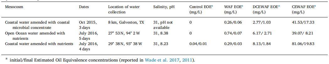 海水是從墨西哥灣收集的,用于填充 12 罐,每個 130 L,其中 4 個處理一式三份: 對照(海水)、WAF(用 Macondo 替代油,一種輕質(zhì)低硫原油,化學(xué)性質(zhì)類似于 在深水期間從 Macondo 井中溢出的石油 Horizon 事件)、CEWAF(Corexit + oil 比例為 1:20)和 DCEWAF (CEWAF 稀釋十倍)。 仔細(xì)描述了中間宇宙的設(shè)置 在韋德等人。 (2017) 以及準(zhǔn)備 WAF 的程序, CEWAF 和 DCEWAF。 簡而言之,注入油或油 + Corexit 進(jìn)入帶擋板的再循環(huán)罐并混合約 24 小時,然后將下層 分?jǐn)?shù)(即,避免表面光滑)被添加到各自的 坦克。 有關(guān)中宇宙實(shí)驗(yàn)的信息在表 1 中給出 根據(jù)估計值添加初始和最終油濃度 根據(jù) Wade 等人確定的油當(dāng)量 (EOE)。 (2011 年,2017 年)。 實(shí)驗(yàn)持續(xù) 3 到 5 天,運(yùn)行 12:12 明暗循環(huán)。 在表 1 中,對于使用沿海 用微生物濃縮物修正的水域,浮游生物(≥63 μm)是 用網(wǎng)收集并轉(zhuǎn)移到聚碳酸酯瓶中。 這個 將濃縮的浮游生物塊引入罐中并攪拌(2 L 到每個)在開始實(shí)驗(yàn)之前。 對于公海水域和沿海水域的中宇宙,營養(yǎng)物質(zhì)進(jìn)行了修正, 添加營養(yǎng)物(最終濃度 f/20)并攪拌罐。